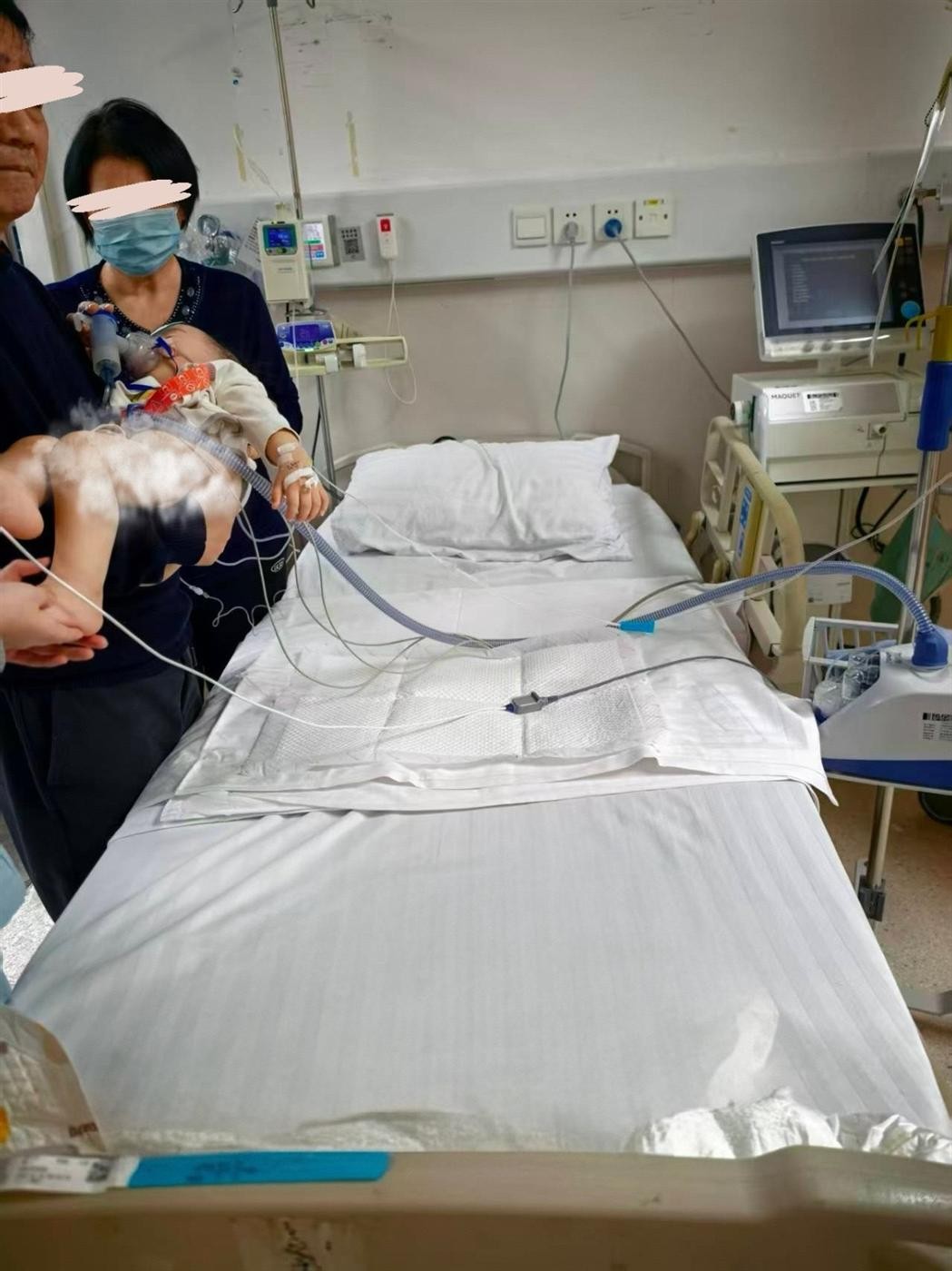 急诊医生见状瞬间警觉,洋洋哭闹不止,无法安抚,嘴唇灰暗,点头呼吸,三凹征(+),双肺大量喘鸣音及湿啰音,心率220次/分,测血氧饱和度70%,初步判断“重症肺炎合并呼吸衰竭、心力衰竭!”。医生立即同步启动两项关键动作:一边联系儿童呼吸与重症医学科准备好床位及抢救设施,一边亲自护送患儿往监护病房疾驰,一场与死神赛跑的救援就此展开。