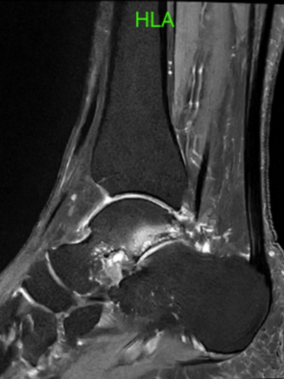 术前踝关节矢状位MRI提示在距骨后突后方可见异常骨结构(三角骨)并伴有骨髓水肿,周围伴随滑膜增生、软组织水肿(高信号影)