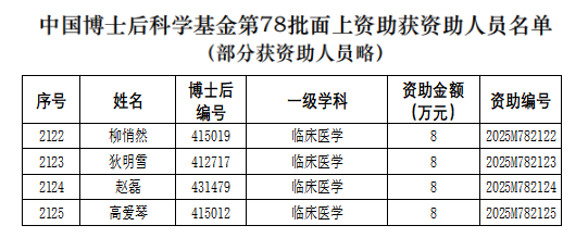 医院4人获批中国博士后科学基金第78批面上资助项目