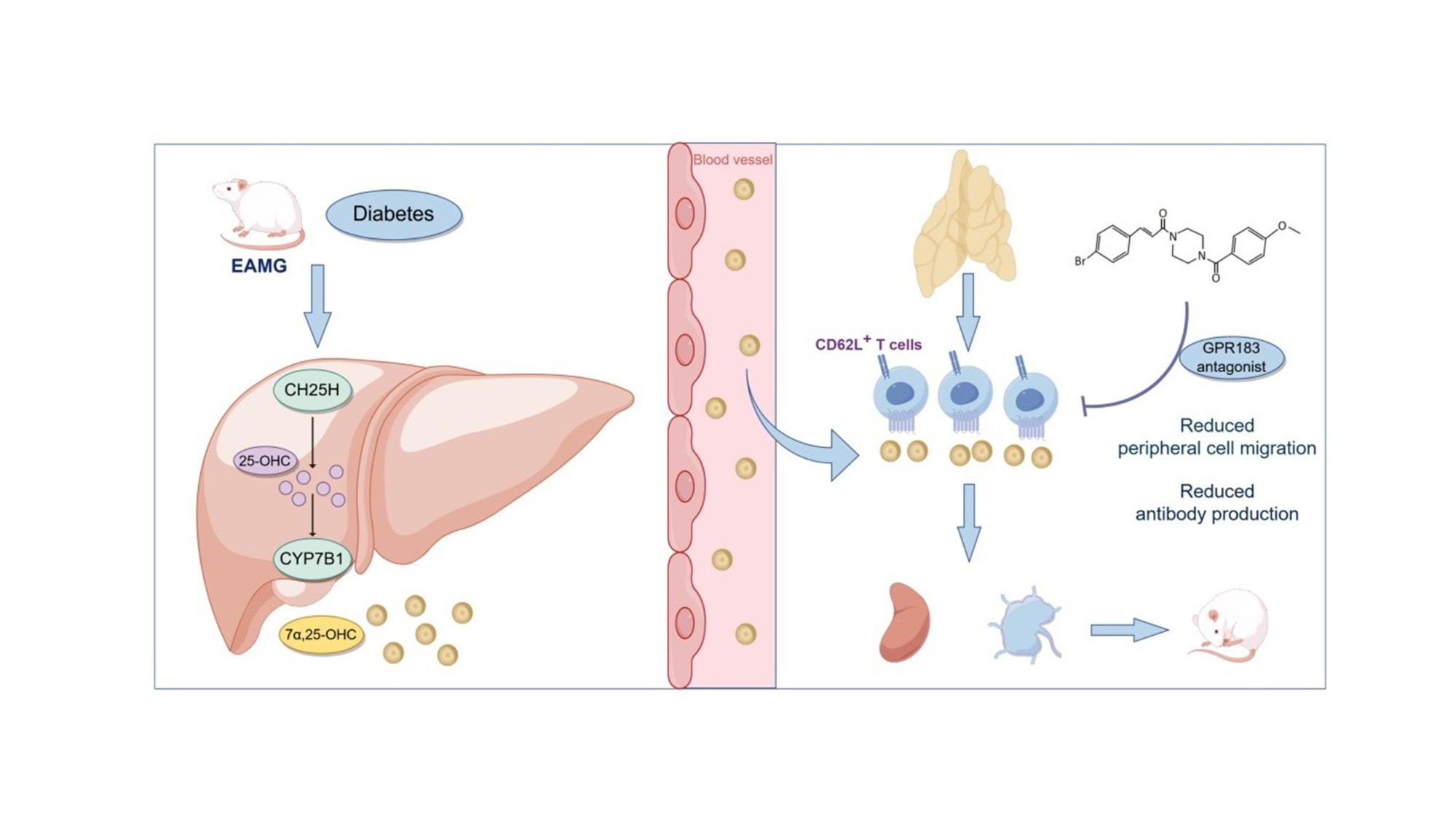 重症肌无力(MG)是一种由自身抗体介导的神经肌肉接头传递障碍的自身免疫性疾病,胸腺异常在MG中常见。本研究团队的前期研究结果发现2型糖尿病是MG的危险因素,合并糖尿病的MG大鼠模型症状更重,体液免疫反应更强。在这项研究中,作者发现了糖尿病加重MG的另一重要机制,糖尿病可上调胸腺T细胞(尤其是CD62L⁺成熟T细胞)上GPR183受体的表达。同时,糖尿病通过肝脏胆固醇代谢重编程,促进其配体7α,25-OHC的合成,GPR183–7α,25-OHC轴的活化促进胸腺T细胞向外周迁移,加剧自身免疫反应。此外研究应用GPR183抑制剂NIBR189具有治疗潜力,可抑制GPR183可阻断CD62L⁺T细胞的外迁,减少外周自身抗体水平,同时增强Treg细胞比例,抑制Tfh和浆细胞分化,改善免疫失衡。本研究为临床治疗合并糖尿病的重症肌无力患者提供了一个新的潜在药物靶点。本团队创新性的提出糖尿病性重症肌无力的概念并在此领域发表了一系列原创性研究成果。