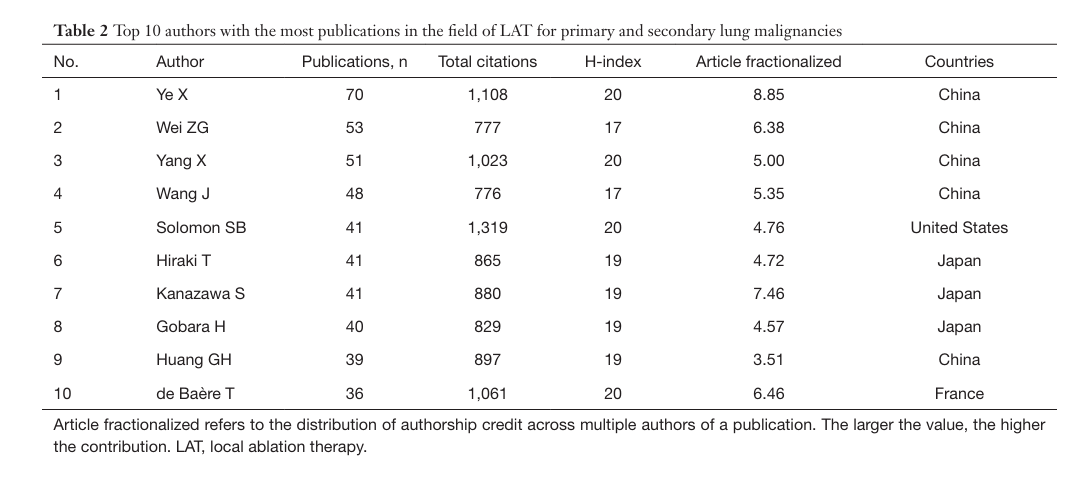 文章分段(fractionated)指将作者署名权分配给同一出版物的多位作者。数值越大,贡献度越高。LAT,局部消融疗法。