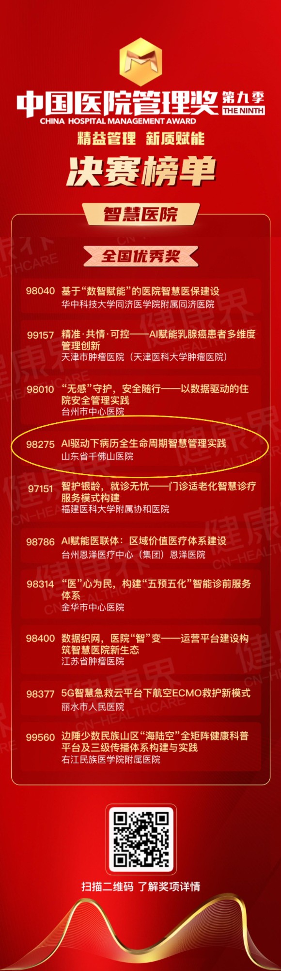 10月18日,第九季中国医院管理奖决赛在上海举行,医院报送的“AI赋能病历全生命周期智慧管理”从全国27个省、自治区、直辖市442家医疗机构的2410个参赛案例脱颖而出,获得第九季中国医院管理奖——智慧医院主题优秀奖。