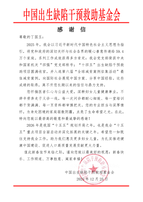 中国出生缺陷干预救助基金会在感谢信中高度评价她“怀揣医者仁心与公益大爱,深耕妇女儿童健康事业”,并对其在推动出生缺陷干预救助工作中的突出贡献致以敬意。