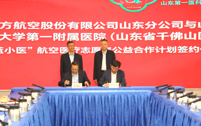 4月22日,中国东方航空股份有限公司山东分公司与山一大一附院(省千佛山医院)签署“空中蓝小医”航空医疗志愿者公益合作协议。校(院)党委委员、医院党委书记孙志坚,党委委员、副院长肖伟出席签约仪式。此举标志着医院在“航空+医疗”公益融合领域迈出关键一步,开启院航协同、守护空中生命健康的全新篇章。