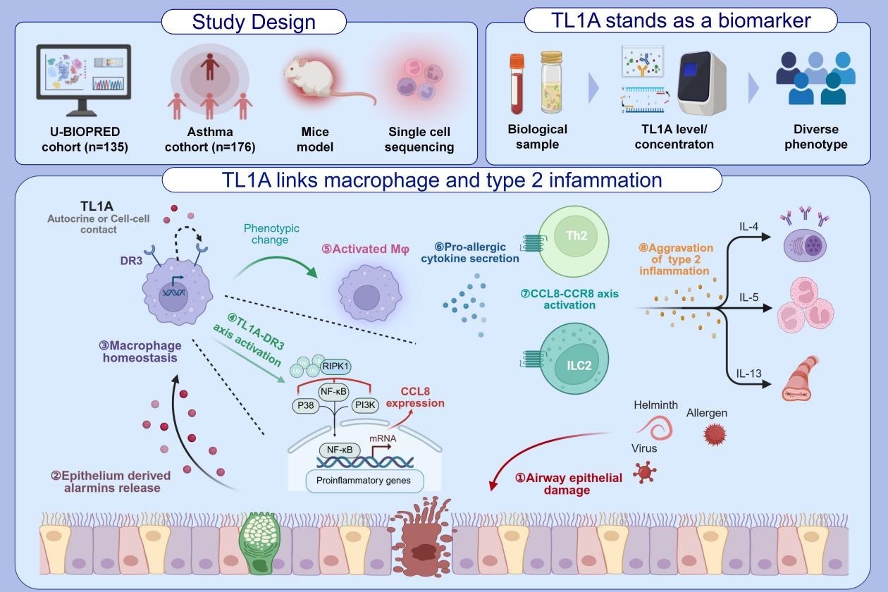 本研究前期研究结果发现肿瘤坏死因子样配体1A(TL1A)是重症哮喘的关键免疫靶标并与多个哮喘表型密切相关。进一步利用单细胞测序技术、基因编辑动物模型及临床样本分析,明确巨噬细胞是过敏炎症背景下TL1A的主要免疫来源细胞。研究证实巨噬细胞TL1A通过激活受体DR3,通过CCL8-CCR8信号轴放大2型炎症反应参与过敏原诱导的气道炎症、嗜酸性粒细胞浸润、Th2型细胞因子分泌及黏液过度分泌。揭示了TL1A在过敏气道环境的诱发因素并利用小动物microCT等技术在慢性重度哮喘模型中验证了抗TL1A中和抗体的治疗效果,其动态影响致病性CD8+效应记忆T细胞在内的免疫细胞,调节先天免疫和适应性免疫,实现多维度的干预。该研究系统阐明TL1A在哮喘发病中的核心作用,证实其作为“生物标志物—治疗靶点”的双重价值,为哮喘精准治疗提供了全新策略。