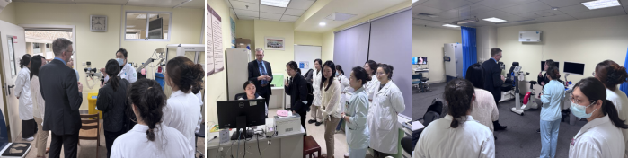 随后,Tom Fardon教授实地参访了重度哮喘诊疗中心,包括肺功能室、FeNO检测室、过敏原检测实验室及免疫治疗室等关键区域。科室围绕重度哮喘中心建设、标准化诊断、精准治疗、药学服务及康复管理等关键环节,全面呈现呼吸与危重症医学重度哮喘诊疗中心以规范化流程为基石、精准分型为导向、药学康复为两翼所构建的重度哮喘全程管理生态。