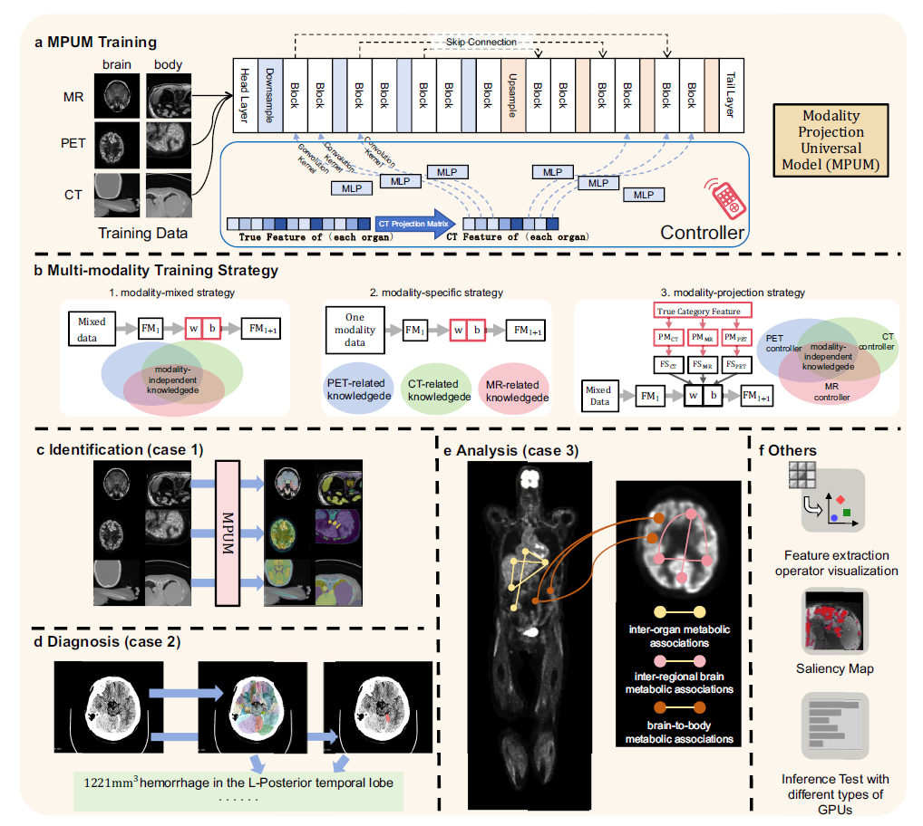 重大疾病的病理改变常跨越脑、心、肝等多个系统,多模态影像分割技术为跨器官代谢分析提供结构依据。本研究MPUM基于多模态医学影像数据训练,通过独特的“模态投影”机制,将共享的潜在特征动态投射至不同成像模态的特征空间,克服了传统多模态模型中的特征冲突与训练不稳定问题。实验表明,MPUM在脑部与全身结构分割任务中,其评分均优于当前主流通用分割模型。该模型不仅在颅内出血的快速定位与定量分析中展现出临床辅助诊断价值,还首次从全身代谢角度揭示了癫痫与阿尔茨海默病中脑区之间及脑与躯体之间的代谢关联,为探索脑—体轴系统性机制提供了新工具。MPUM具备高密度标注、强泛化能力和良好的可解释性,支持从急性诊疗到系统性研究的多种应用场景,标志着医学影像分析向多模态、全身化、通用化迈出关键一步。
