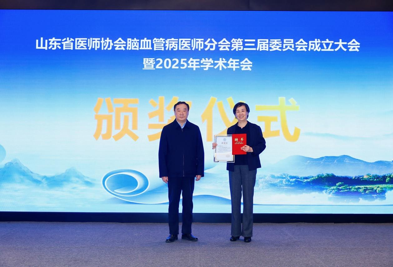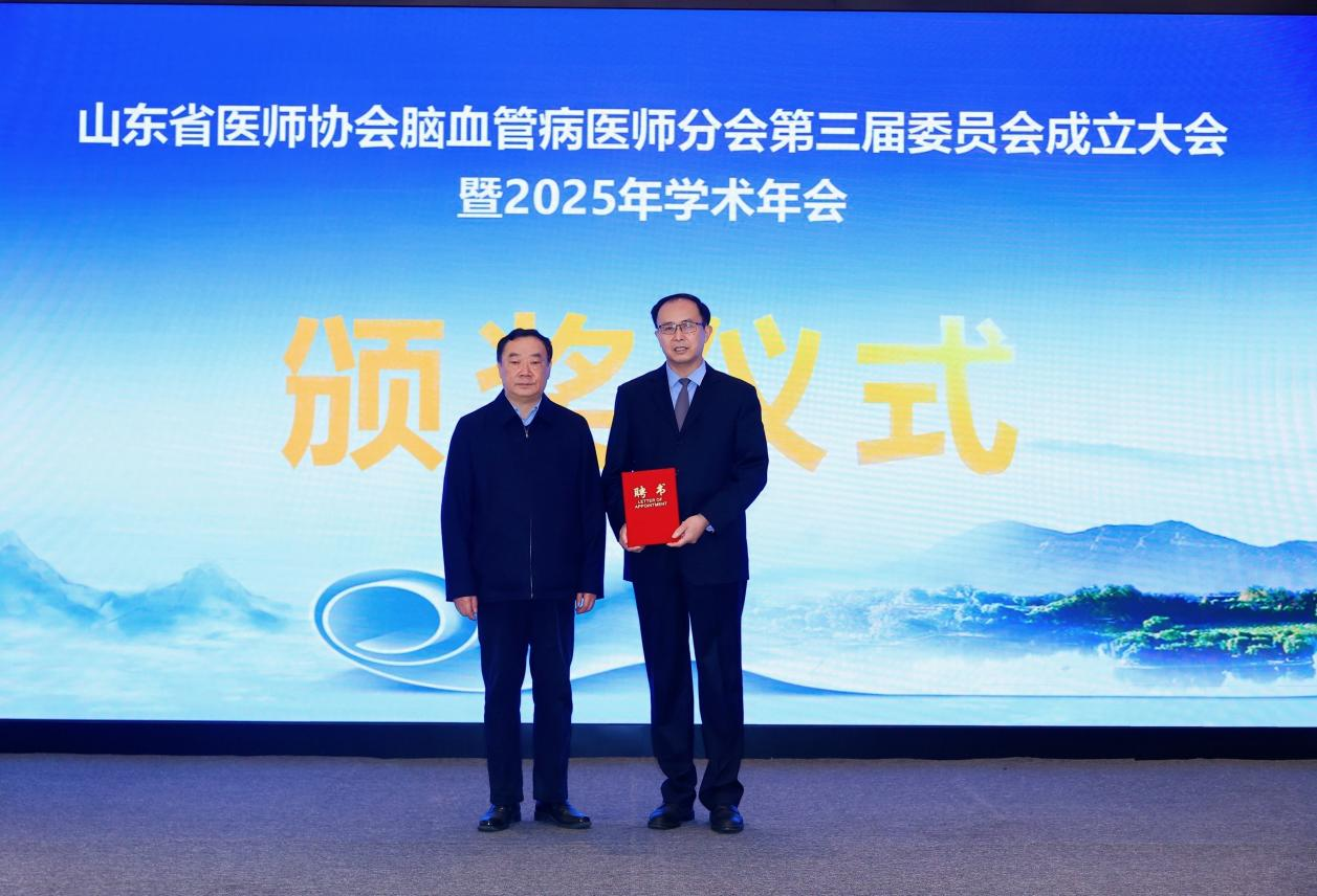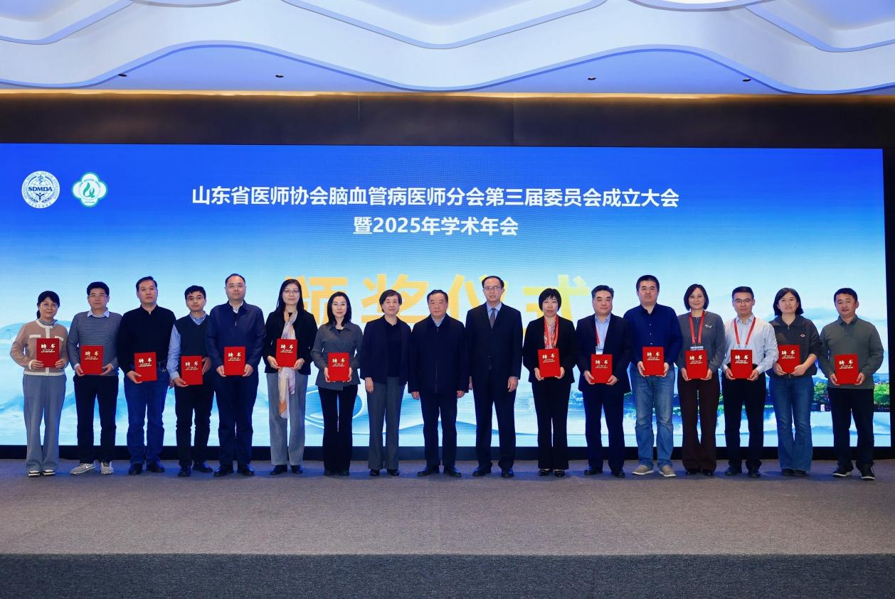 11月21-23日,山东省医师协会脑血管病医师分会换届选举会议暨2025学术年会在济南召开。经大会民主投票选举,山一大一附院(省千佛山医院)神经内科副主任,卒中中心、神经免疫科亚专业主任李衍滨当选第三届脑血管病医师分会主任委员,朱梅佳教授聘任为名誉主任委员,袁静、刘彬当选副主任委员,赵张宁、张蓬、赵泽宇当选为常务委员。中国医师协会副会长、山东省医师协会会长孙洪军出席会议,并为以上人员颁发聘书。