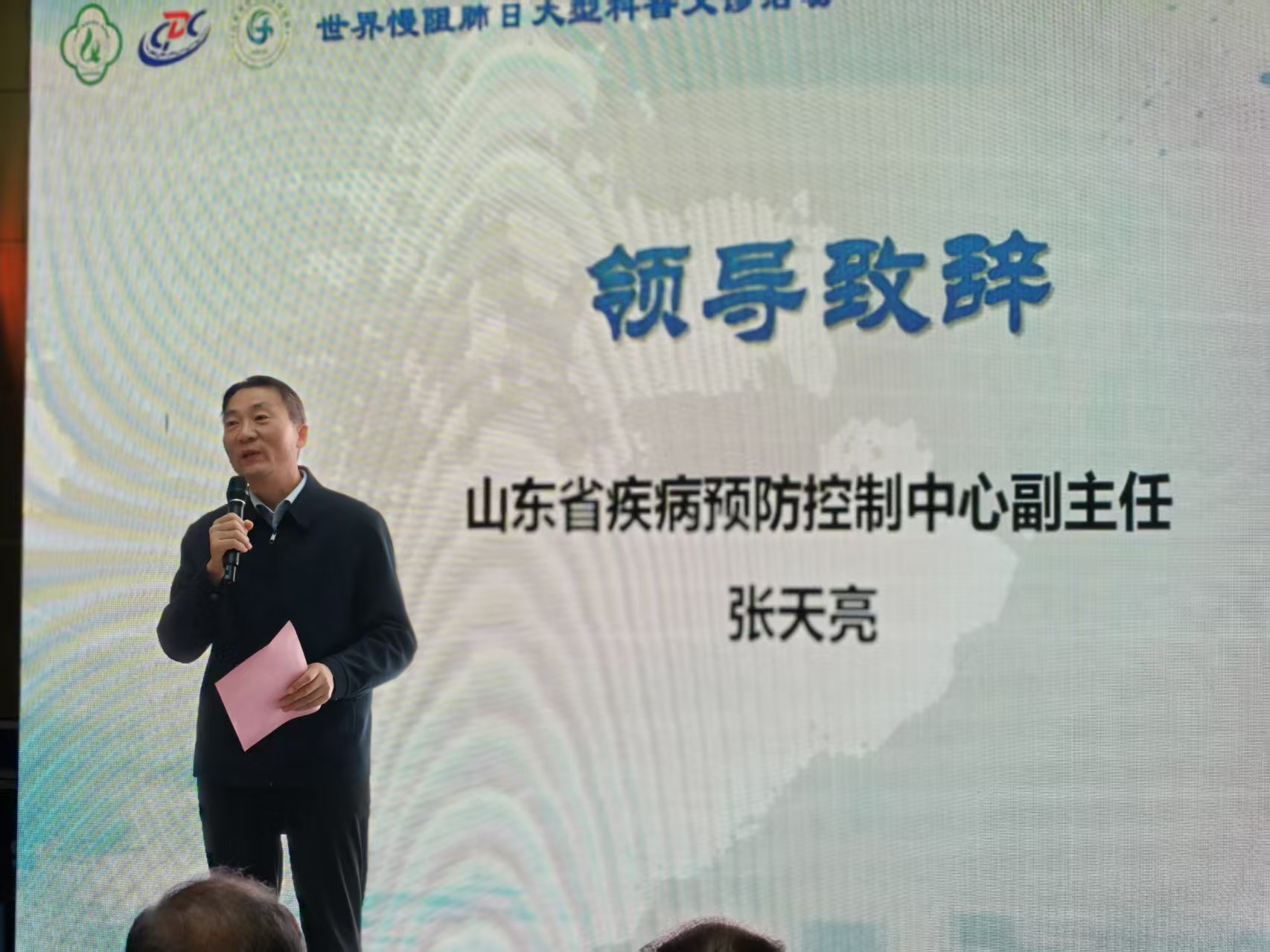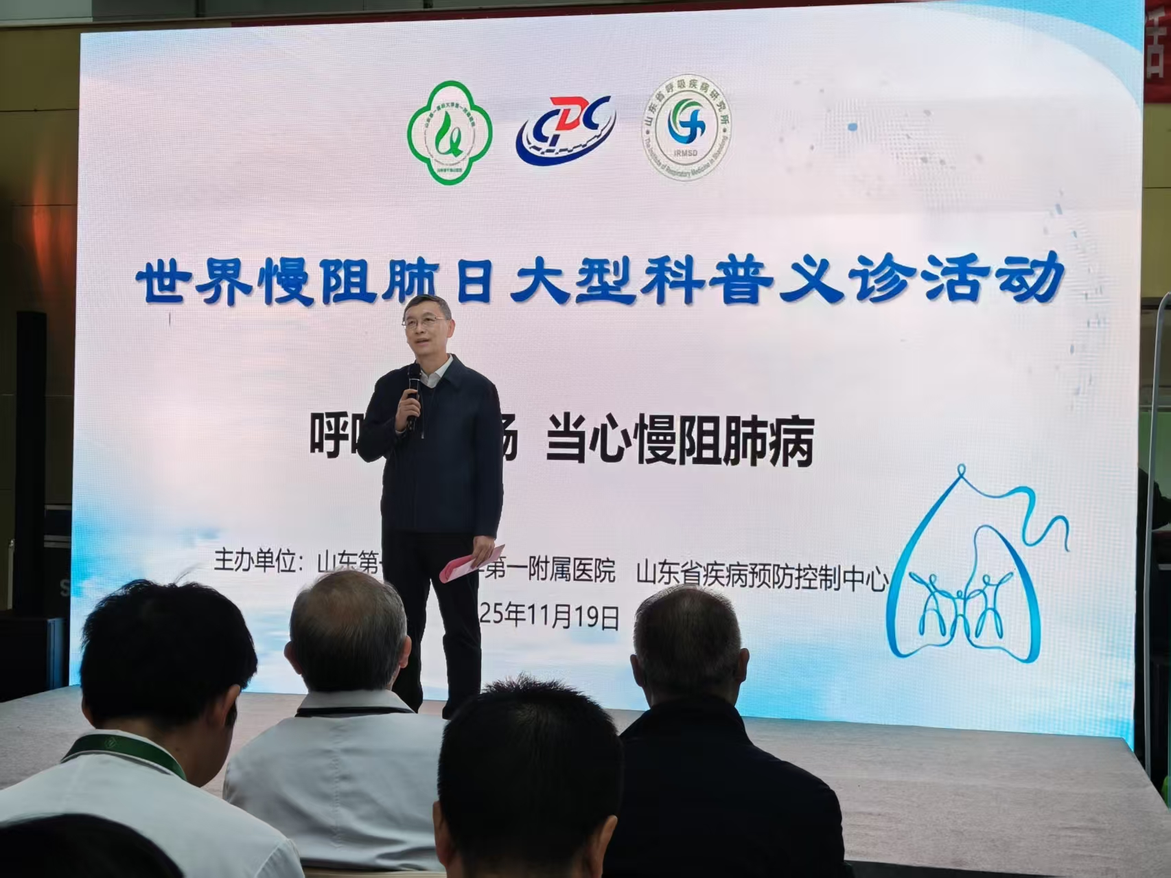 校(院)党委委员、医院党委书记孙志坚,山东省疾病预防控制中心副主任张天亮,山东省疾病预防控制中心慢病所所长、慢病首席专家郭晓雷,我院呼吸与危重症医学科主任、山东省呼吸疾病研究所所长董亮出席活动并致辞。来自两家主办单位的呼吸与危重症医学科、预防医学领域的多位资深专家、济南市及周边基层社区门诊医务人员、新闻媒体界代表广大市民参加此次活动。