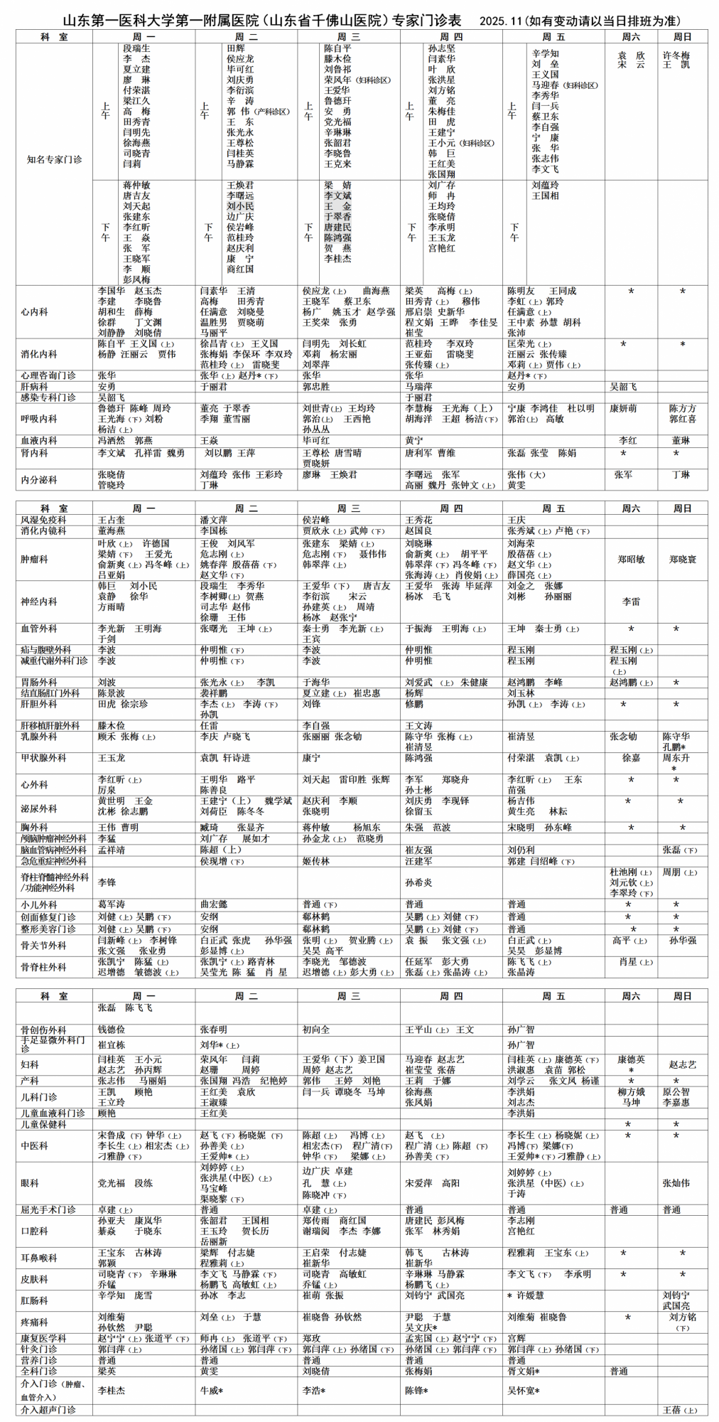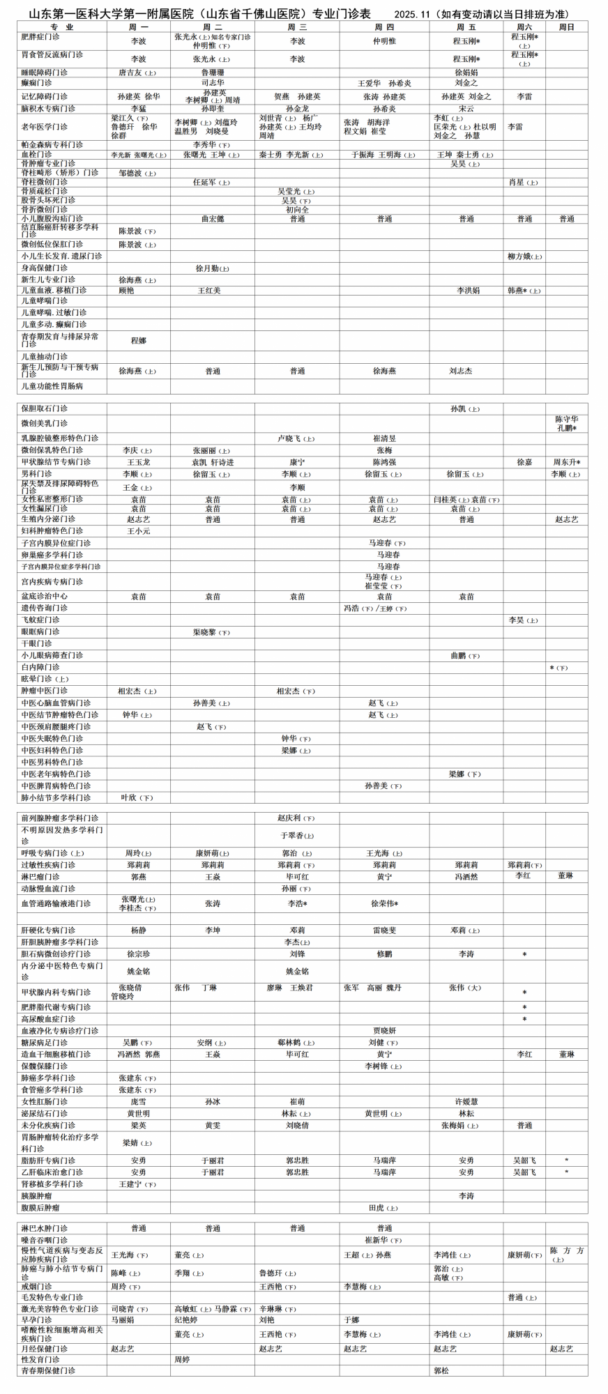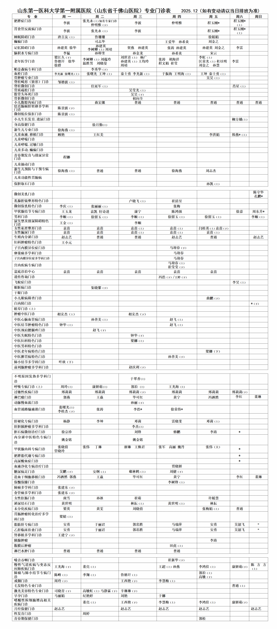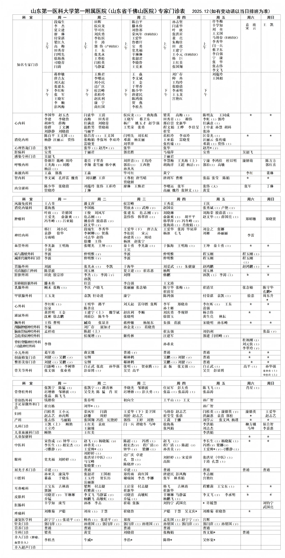 专家门诊表-门诊排班-就医指南-就医版-山东第一医科大学第一附属医院(山东省千佛山医院)【官方网站】